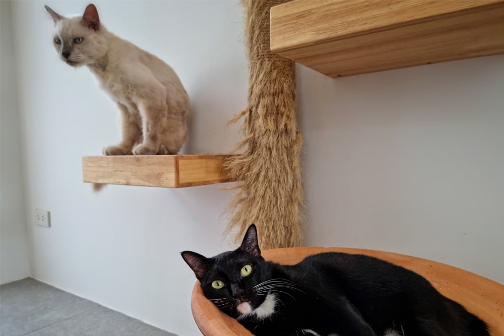 Cats are also highly particular about their surroundings, especially where they eat and eliminate. A condo should always include separate areas for resting, eating, and using the litterbox, allowing cats to relax without the stress of close proximity to their toilet area. Every condo at Just Cats Clinic is designed with this separation in mind to promote calm, hygienic living during your cat’s stay.